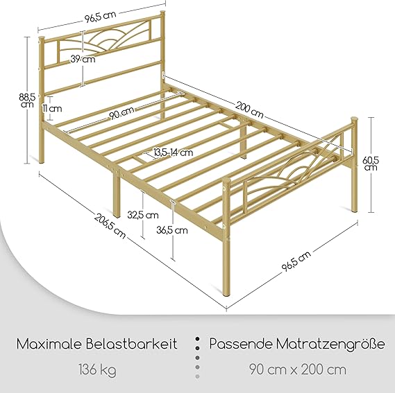 Das Metallbett verfügt über einen stabilen Lattenrost, Kopf- und Fußteil sowie 6 solide Standbeine aus Metall. Mit einer Belastbarkeit von bis zu 136 kg eignet es sich ideal für den täglichen Gebrauch und überzeugt durch Langlebigkeit sowie zuverlässige Stabilität.