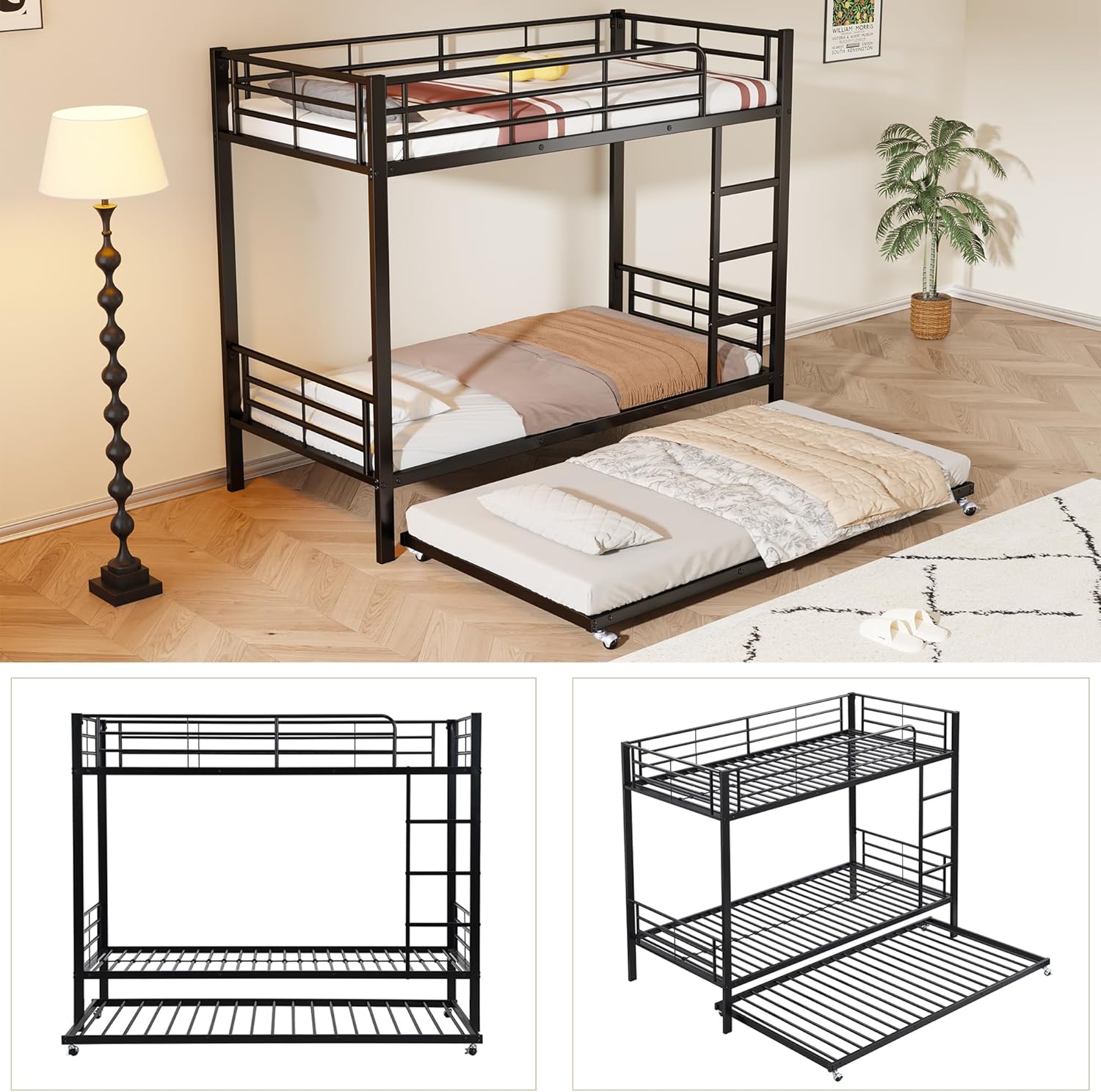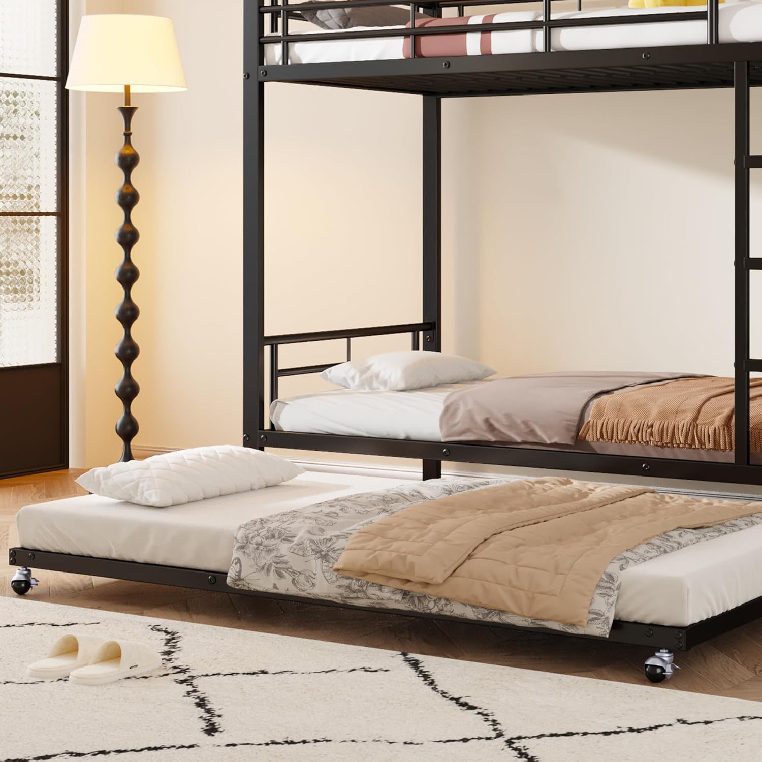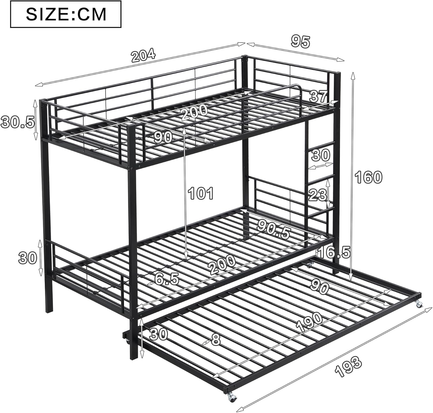 Das obere Bett (90 x 200 cm) in Kombination mit dem ausziehbaren unteren Bett (90 x 190 cm) und den flexiblen Rollen bietet Platz für bis zu drei Personen. Ideal für kleine Zimmer, Gästezimmer oder Kinderzimmer, in denen zusätzlicher Schlafraum benötigt wird.