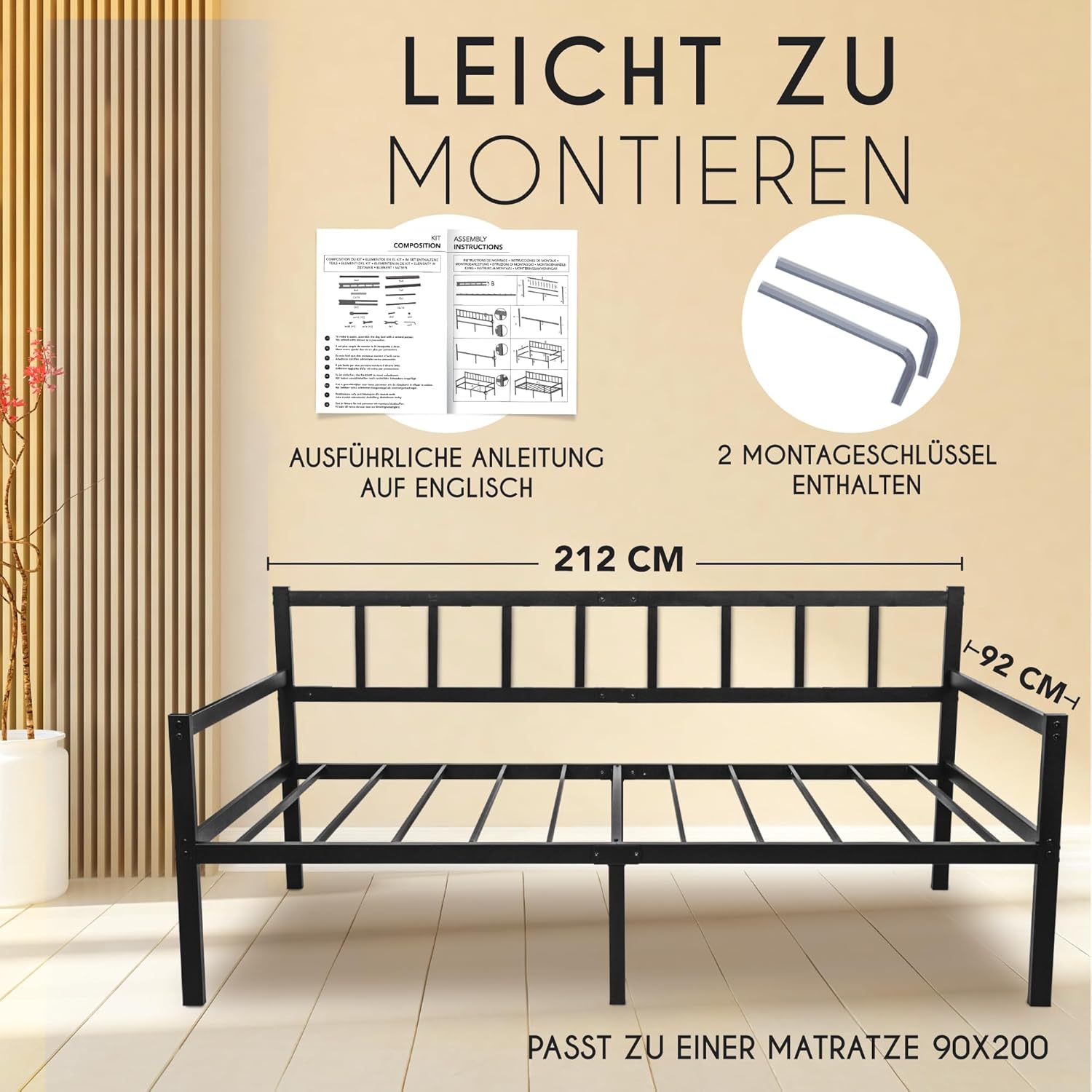 This practical day bed is designed for flexible, around-the-clock use—perfect as a cozy sofa by day and a comfortable sleeping space by night. Suitable for a 90 x 200 cm mattress, the sturdy 92 x 212 cm frame offers a perfect fit, making it ideal for guest rooms, patios, porches, or compact living areas that need multifunctional furniture.