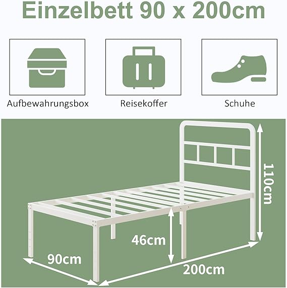 The integrated non-slip foot pads prevent scratches on the floor and reduce annoying noise when moving or lying down. This creates a peaceful and stable sleeping environment. The bed frame is suitable for a standard 90×200 cm mattress, making it ideal for versatile use as a youth bed, guest bed, or single bed in the bedroom.