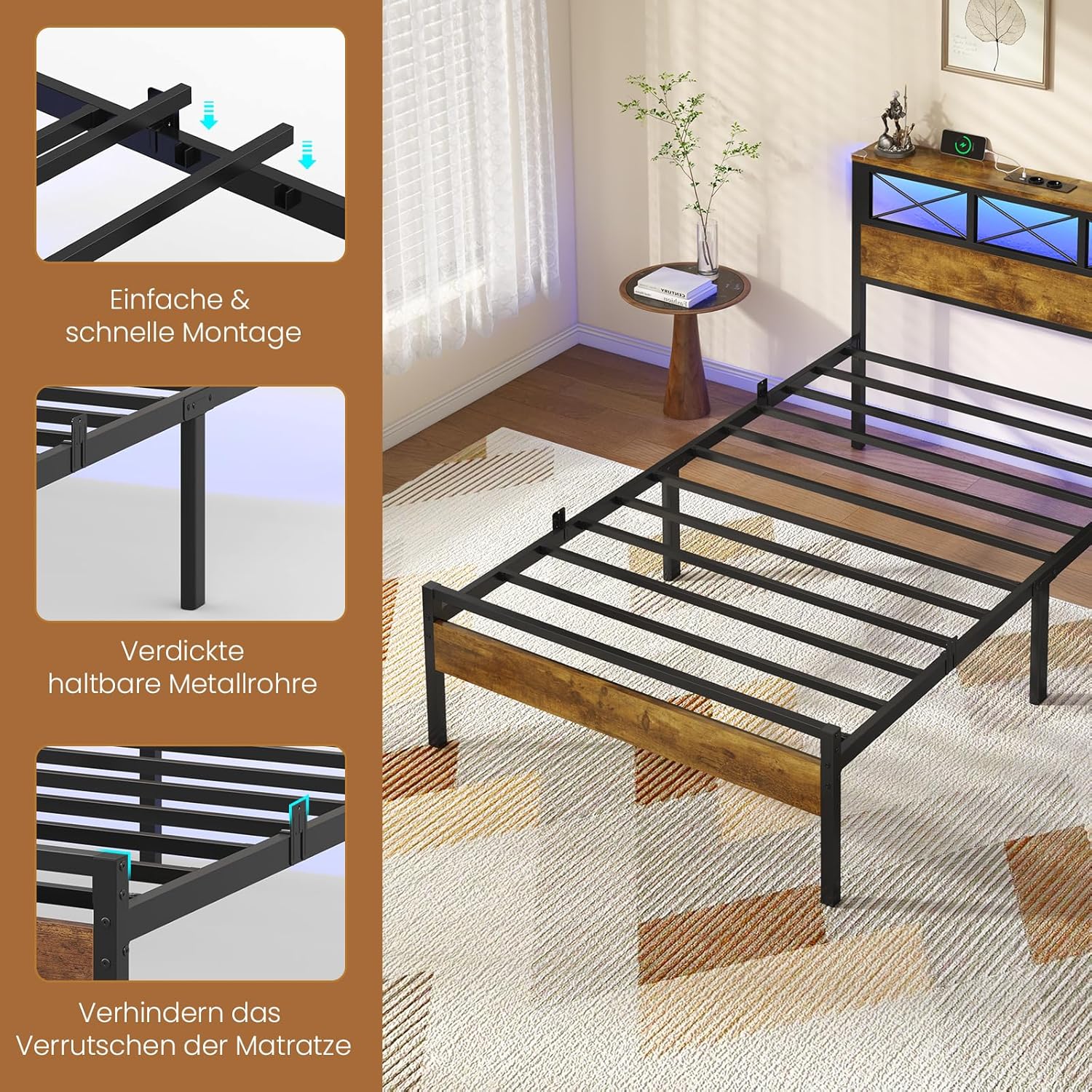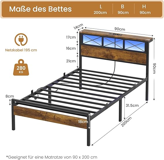 Robust bed frame made of solid metal with a durable slatted frame (up to 280 kg load capacity). EVA cushioning strips reduce friction noise and ensure a peaceful sleeping environment.