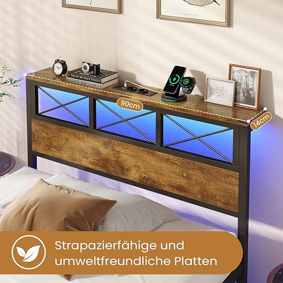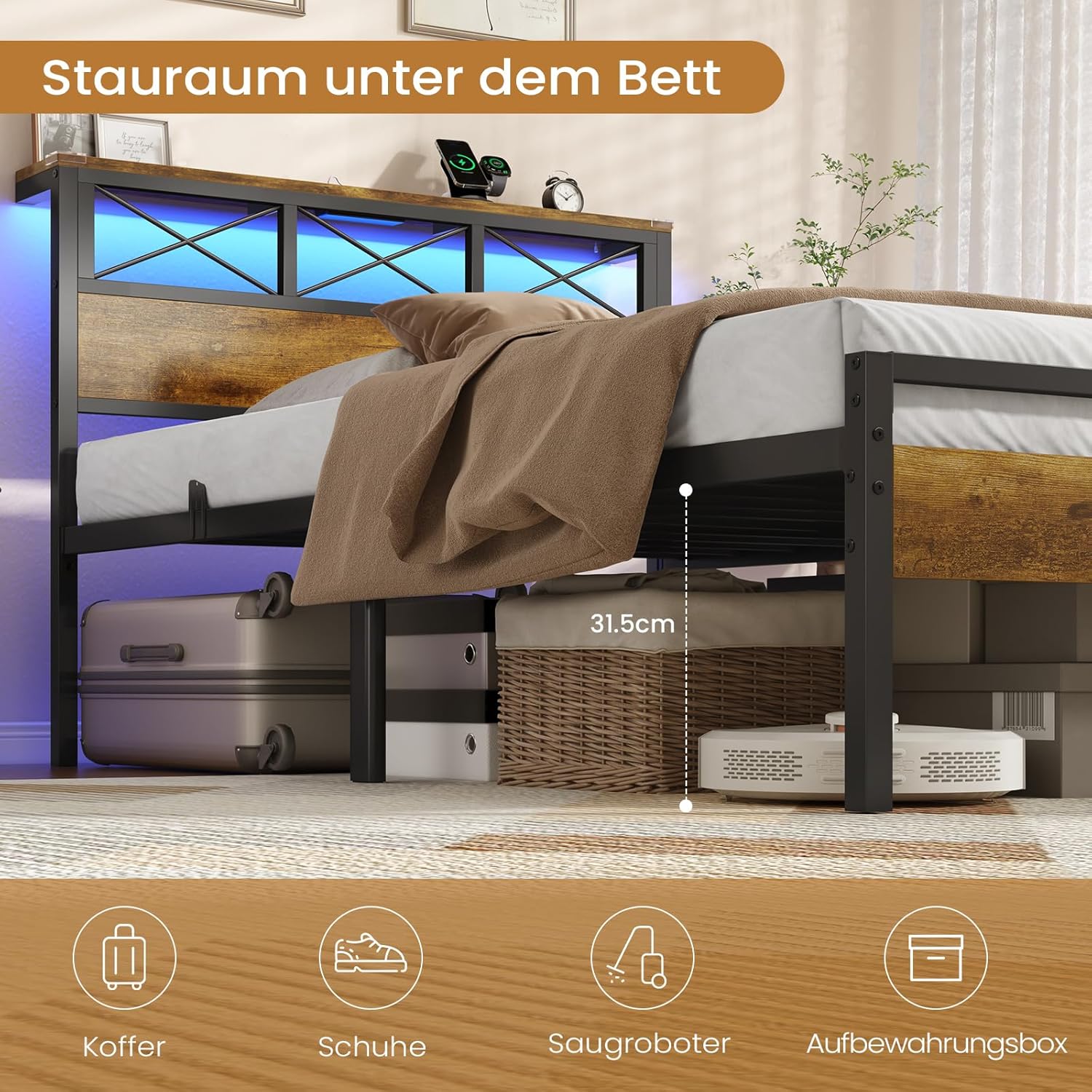 31.5 cm of space under the bed provides room for suitcases, boxes, and rarely used items. A shelf at the headboard is perfect for books, cell phones, alarm clocks, or other items you want to keep handy.