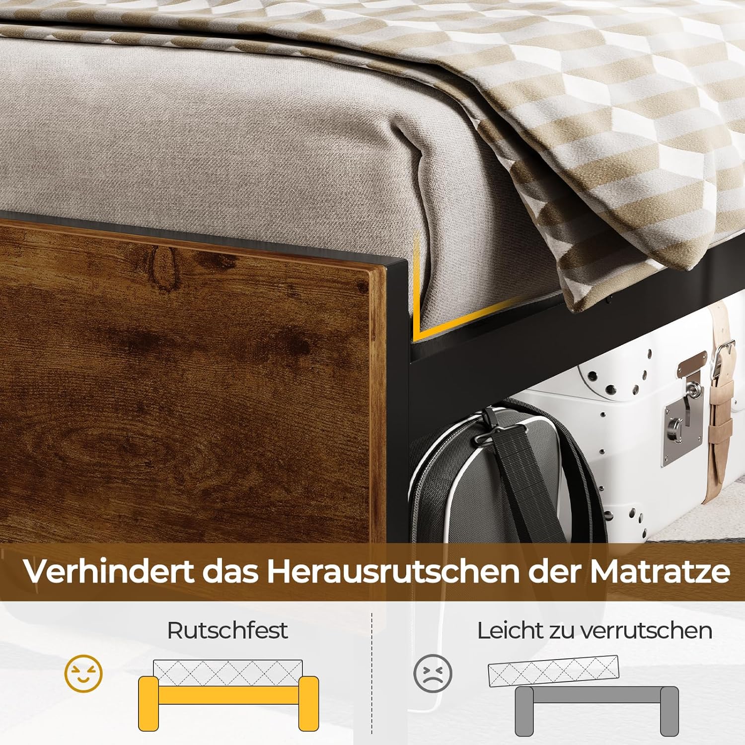Der hohe Kopf- und Fußteil verhindert das Verrutschen der Matratze und passt sich verschiedenen Matratzenhöhen an. Der komfortable Holz-Kopfteil lädt zum Anlehnen beim Lesen oder Fernsehen ein. Der zeitlose Industrial-Vintage-Stil unterstreicht Ihren persönlichen Geschmack.