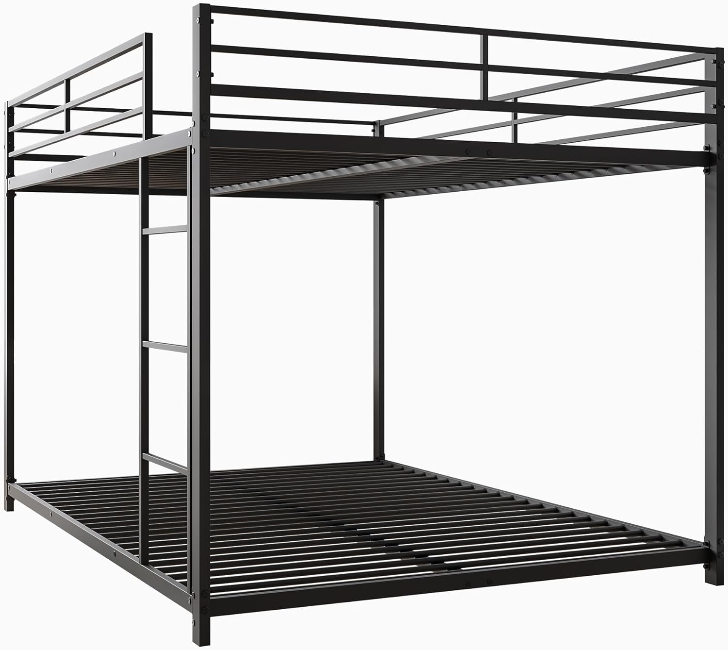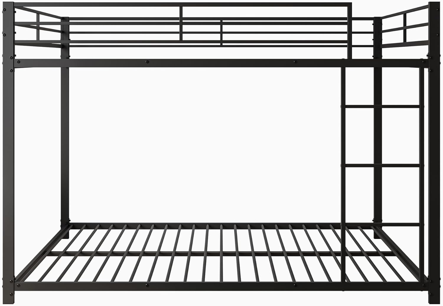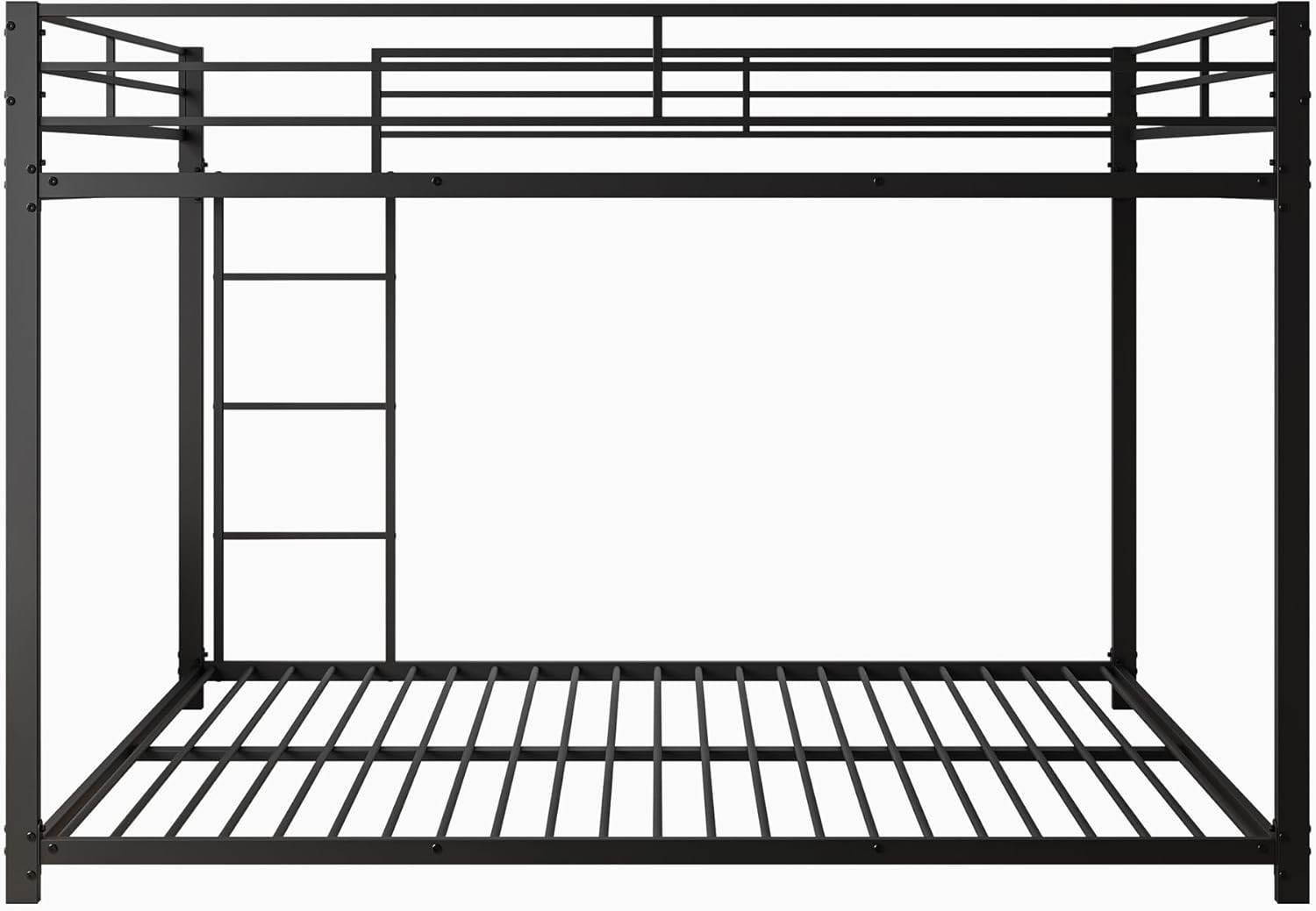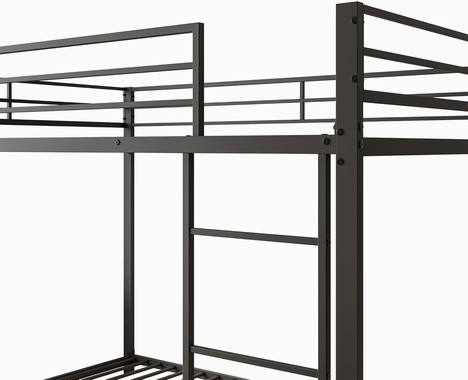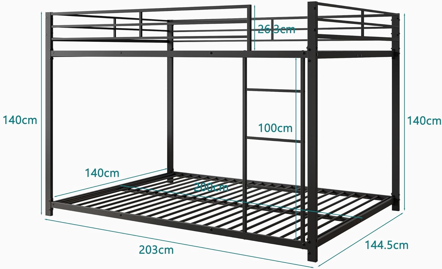 Das obere Bett ist mit 26 cm hohen Sicherheitsgittern ausgestattet und besitzt einen stabilen Lattenrost mit 23 Eisensprossen. Beide Liegeflächen sind bis 120 kg belastbar. So bietet das Metall-Etagenbett maximale Stabilität und Schutz für Ihr Kind beim Schlafen.