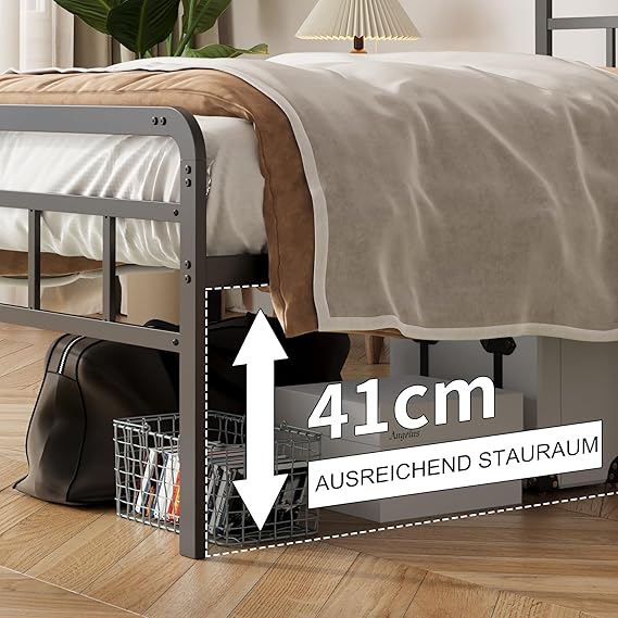 Der Bettrahmen besteht aus langlebigem Heavy-Duty-Metall, das für eine besonders hohe Stabilität sorgt. Kopf- und Fußteil sind fest integriert, sodass das Bett selbst bei regelmäßiger Nutzung nicht wackelt. Diese solide Konstruktion gewährleistet eine lange Lebensdauer und zuverlässige Unterstützung für Matratze und Körper.