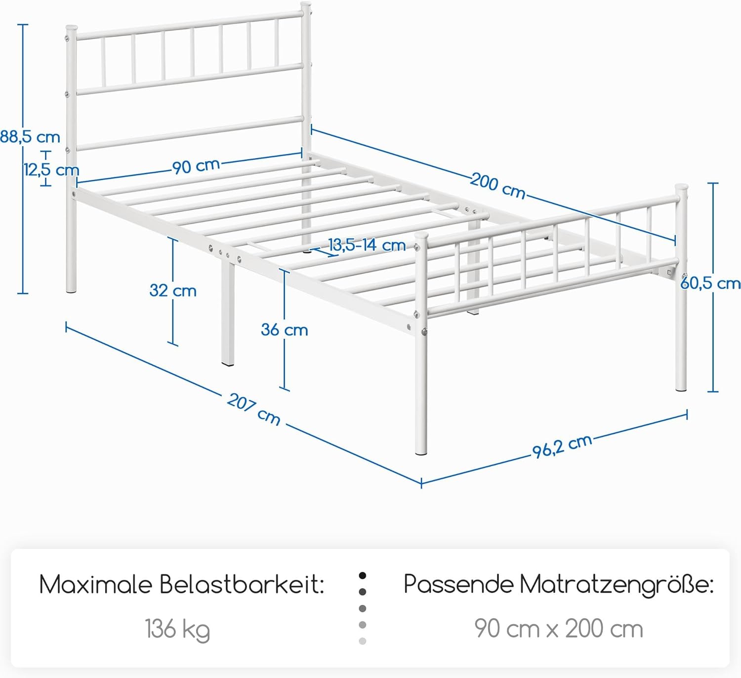 Dieses Metallbett ist für eine Standard-Single-Matratze mit den Maßen 200 cm L × 90 cm B geeignet und kann mit verschiedenen Matratzentypen wie Memory-Schaum, Latex oder Federkernmatratzen verwendet werden, um eine erholsame Nachtruhe nach Ihren Vorlieben zu gewährleisten.