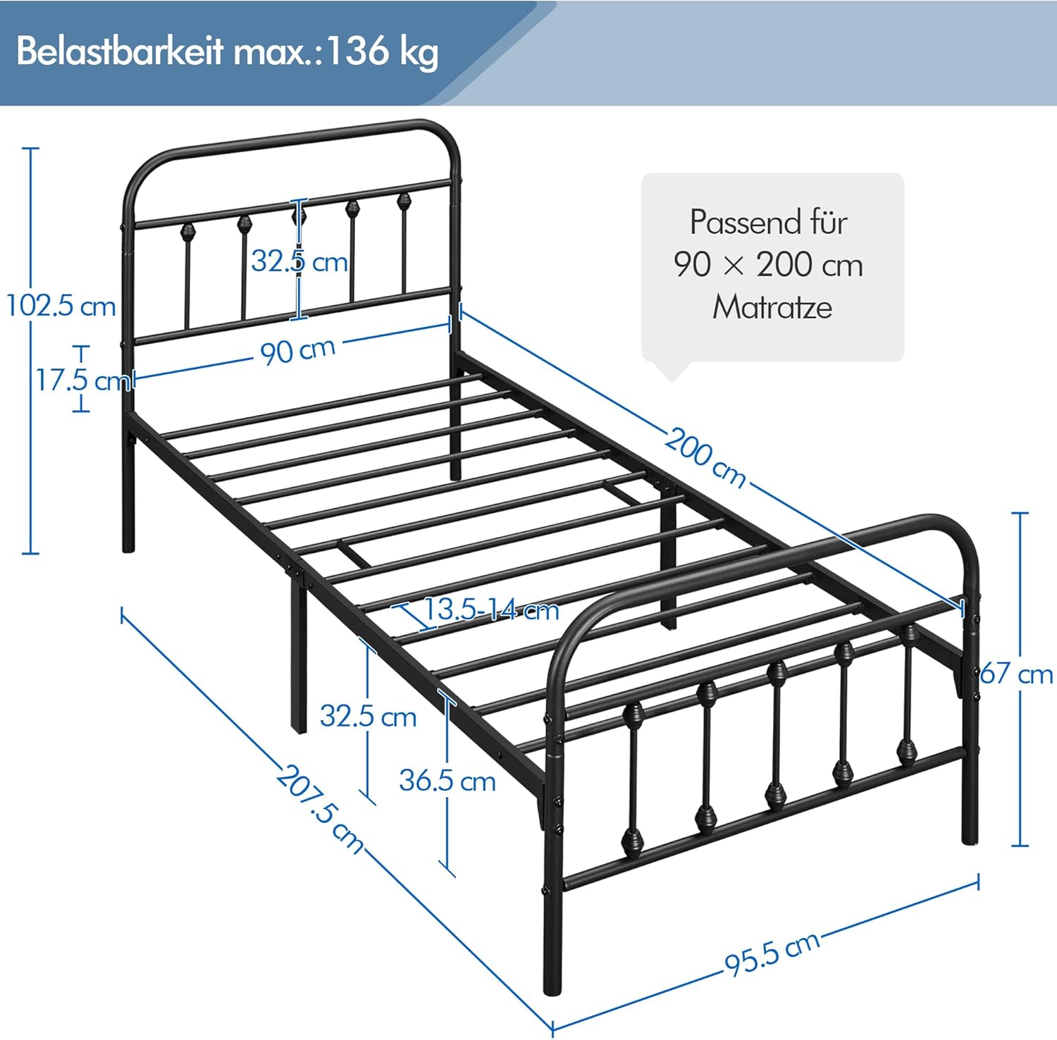 Dieses Metallbett passt zu Matratzen mit den Maßen 200 cm Länge × 90 cm Breite, geeignet für Memory-Schaum-, Latex- oder Federkernmatratzen. Die Maße des Bettrahmens sorgen für eine optimale Passform und sicheren Halt der Matratze.