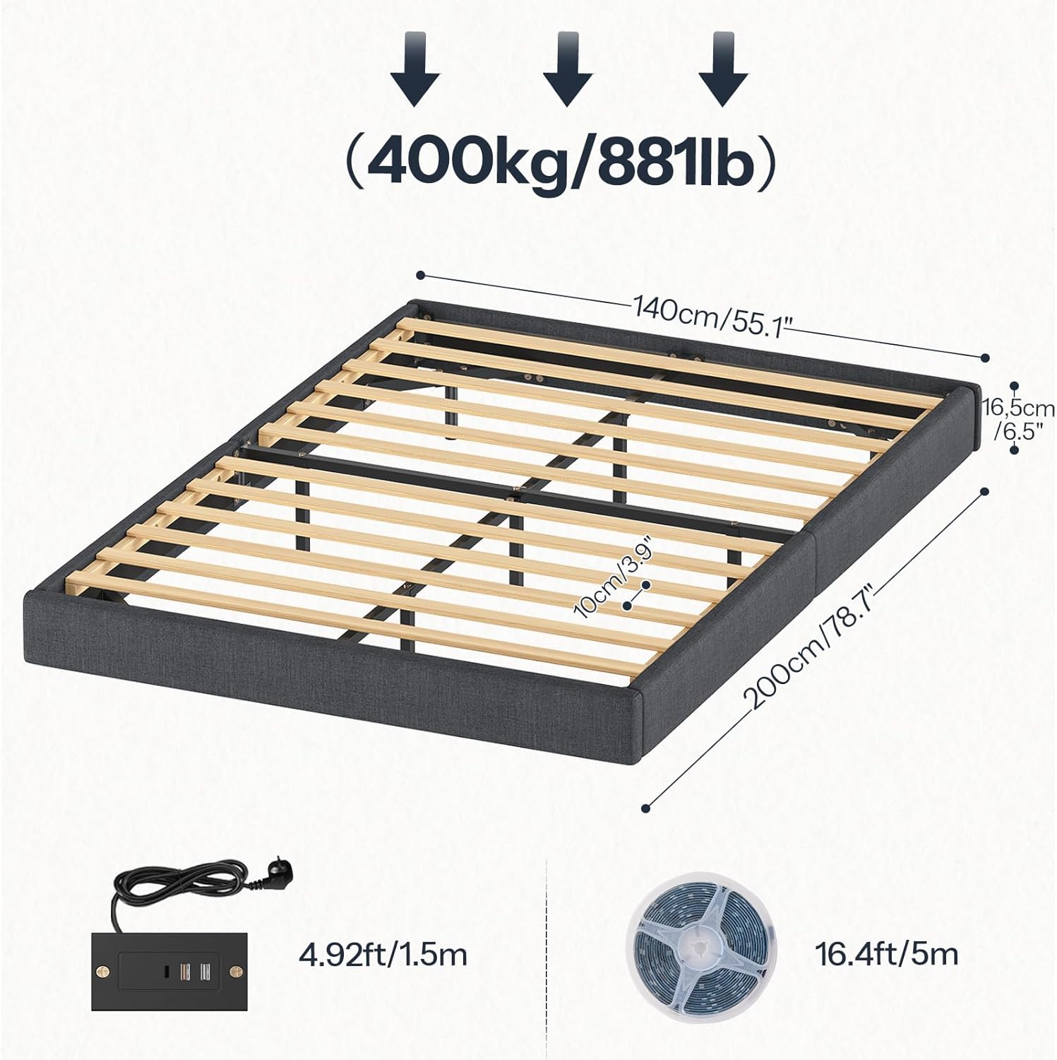 Der robuste Metallrahmen in Kombination mit langlebigen Pappelholzleisten sorgt für hohe Stabilität und eine Tragkraft von bis zu 400 kg. Zusätzlich bieten rutschfeste Endkappen und eine weiche Schaumstoffpolsterung am Bettrahmen Komfort und Sicherheit.