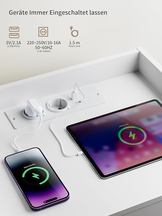 Integrierte Ladestation mit USB-Ports und Steckdosen – perfekt zum einfachen Aufladen von Handy, Tablet, Lampe, Spielkonsole und mehr. Sollte eine Steckdose einmal nicht funktionieren, bieten wir einen kostenlosen Austausch an.