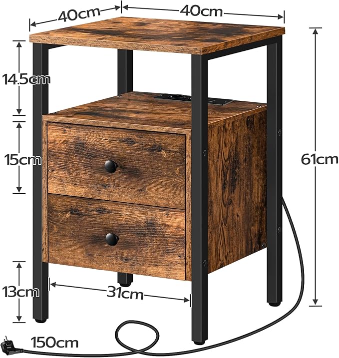 Maße: 40 x 40 x 61 cm. Ausgestattet mit 2 Steckdosen, 2 USB-Anschlüssen und einem 150 cm langen Netzkabel – ideal zum Laden von Smartphone, Tablet, Lampe oder Laptop. Die Ladestation ist bequem erreichbar – direkt an Ihrer Seite.