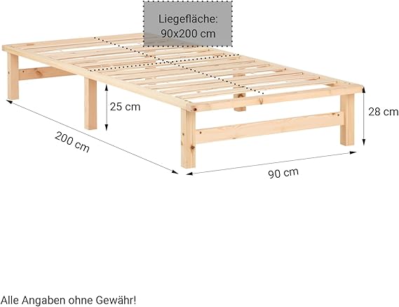 • Practical Dimensions & Smart Clearance – The bed provides a comfortable lying surface of 90 x 200 cm with outer dimensions of 90 x 28 x 200 cm. A 25 cm clearance under the frame offers extra storage space for boxes, bedding, or seasonal items. With a robust material thickness of 30 mm and strong 4.8 cm posts, the bed is engineered for both stability and functionality, making it a reliable centerpiece in any bedroom layout.