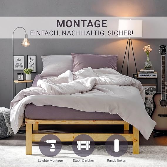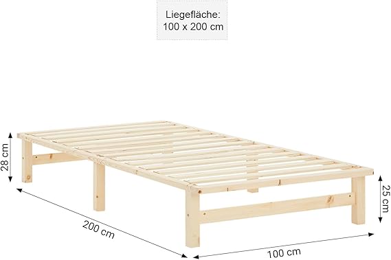 Practical Dimensions for Compact Rooms – The bed provides ideal proportions with a 100 x 200 cm lying surface and overall size of 100 x 28 x 200 cm, making it a space-saving solution for smaller rooms. It features a storage height of 25 cm under the bed, offering extra room for boxes or bedding. With a robust material thickness of 30 mm and sturdy posts of 4.8 cm, it delivers strong structural support while remaining compact and efficient.