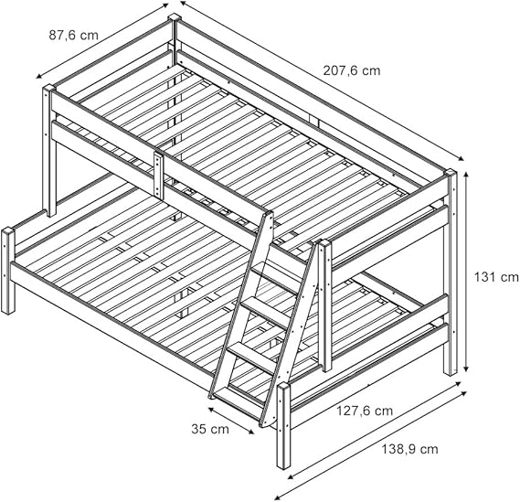 The bunk bed accommodates different mattress sizes to provide versatile sleeping comfort. The lower bed is suitable for a 200 x 120 cm mattress, while the upper bed fits a 200 x 80 cm mattress. With an overall height of 131 cm, the frame is designed to fit well in most standard bedrooms. Full detailed dimensions are shown in the product photos, making planning and setup simple and accurate.