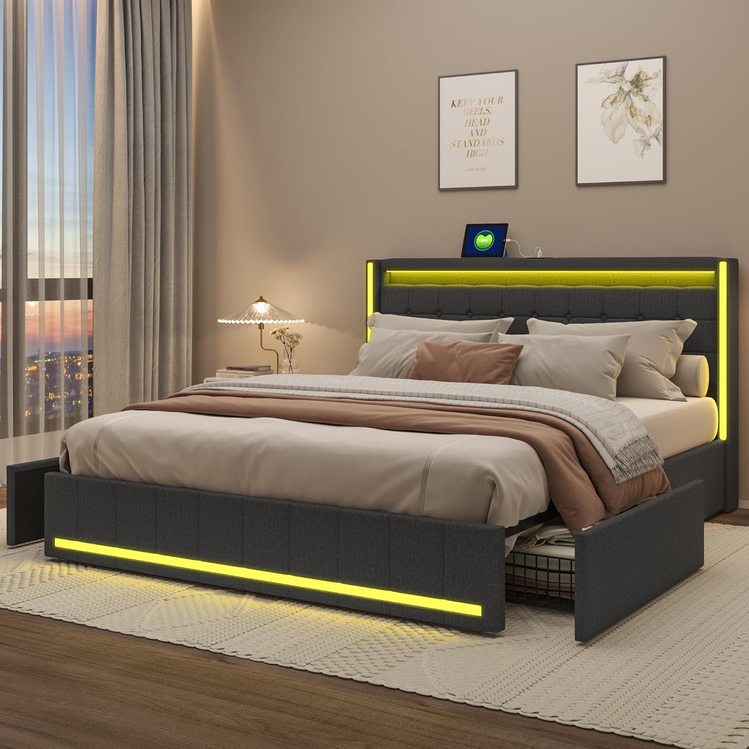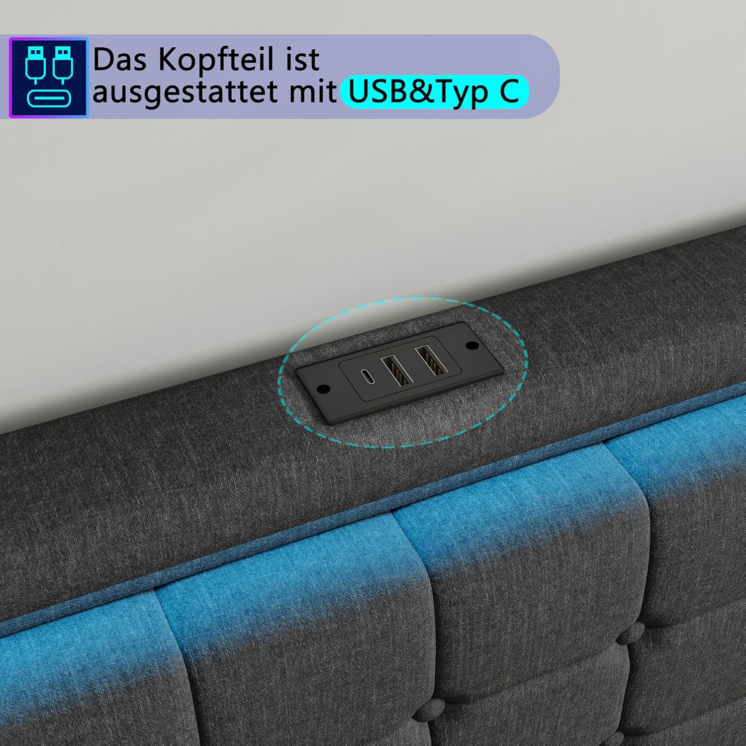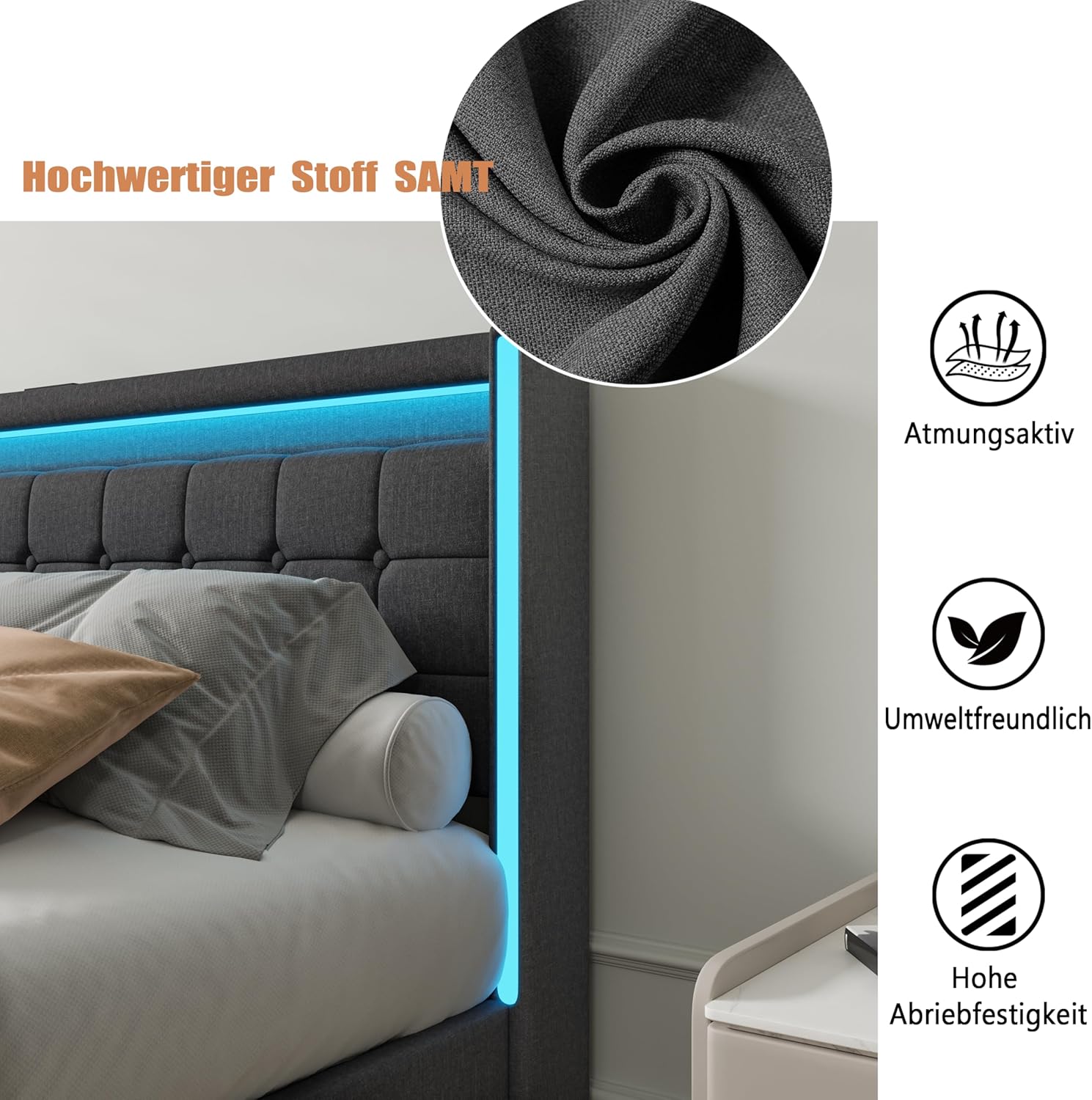 Polsterbett 140×200 mit LED, USB und Stauraum extra