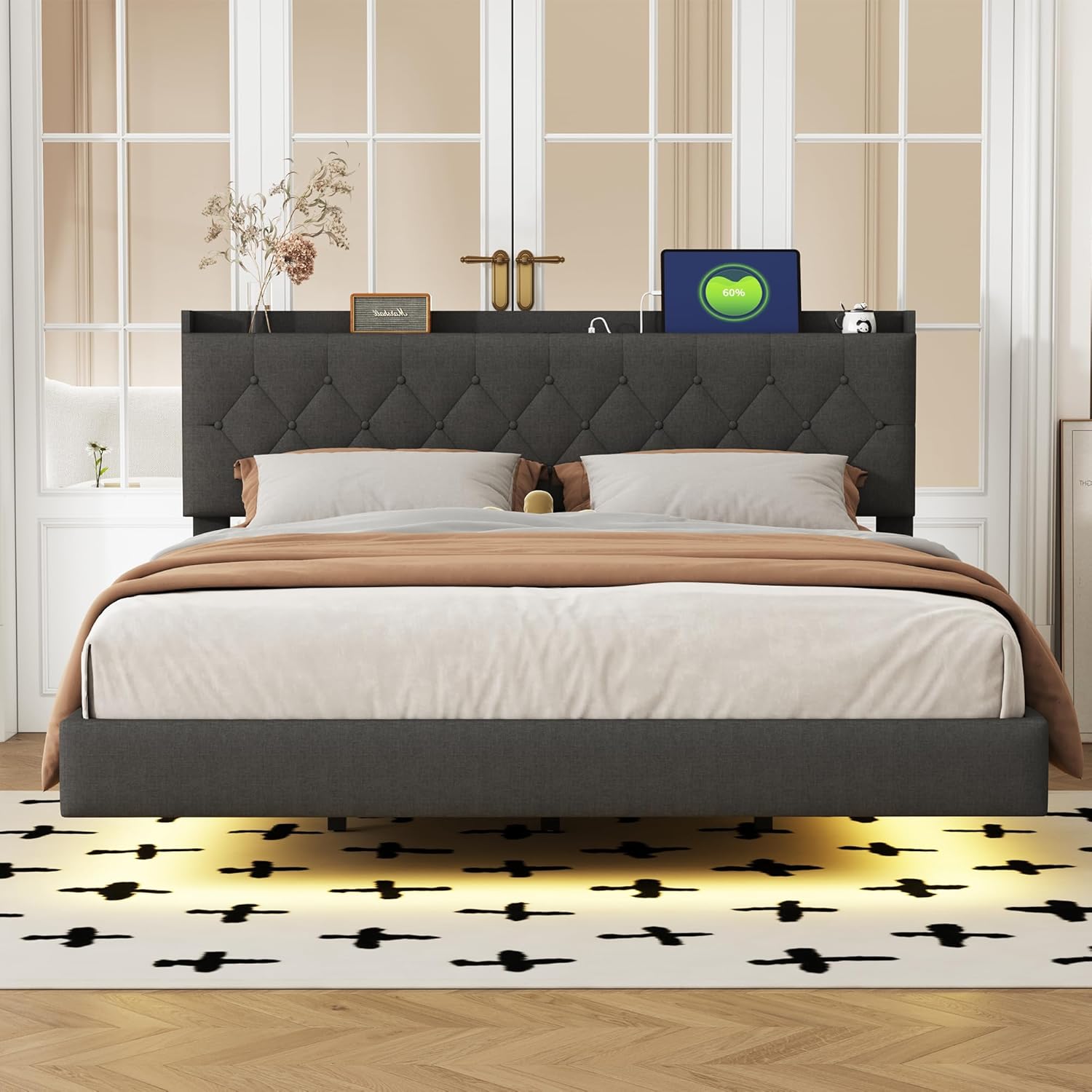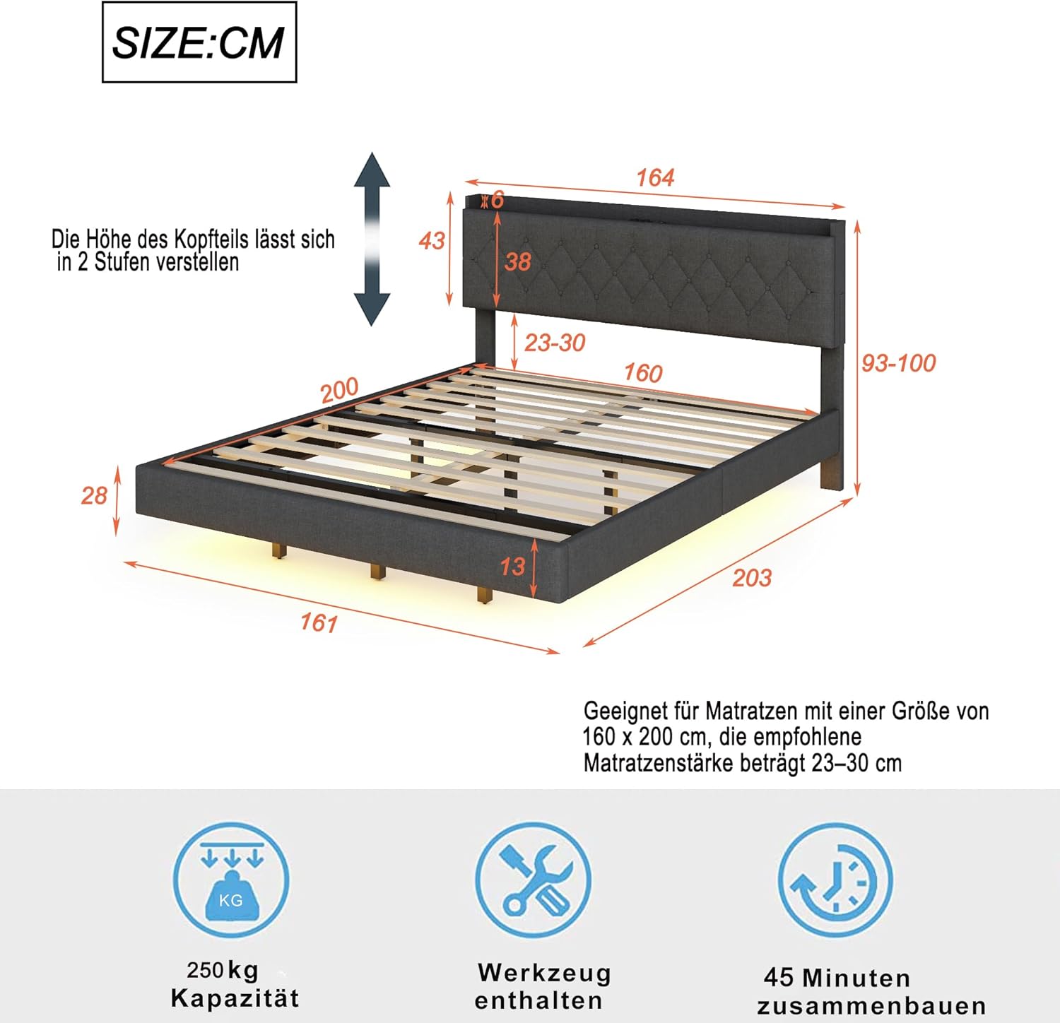 Polsterbett 160×200 mit LED, USB & Stauraum
