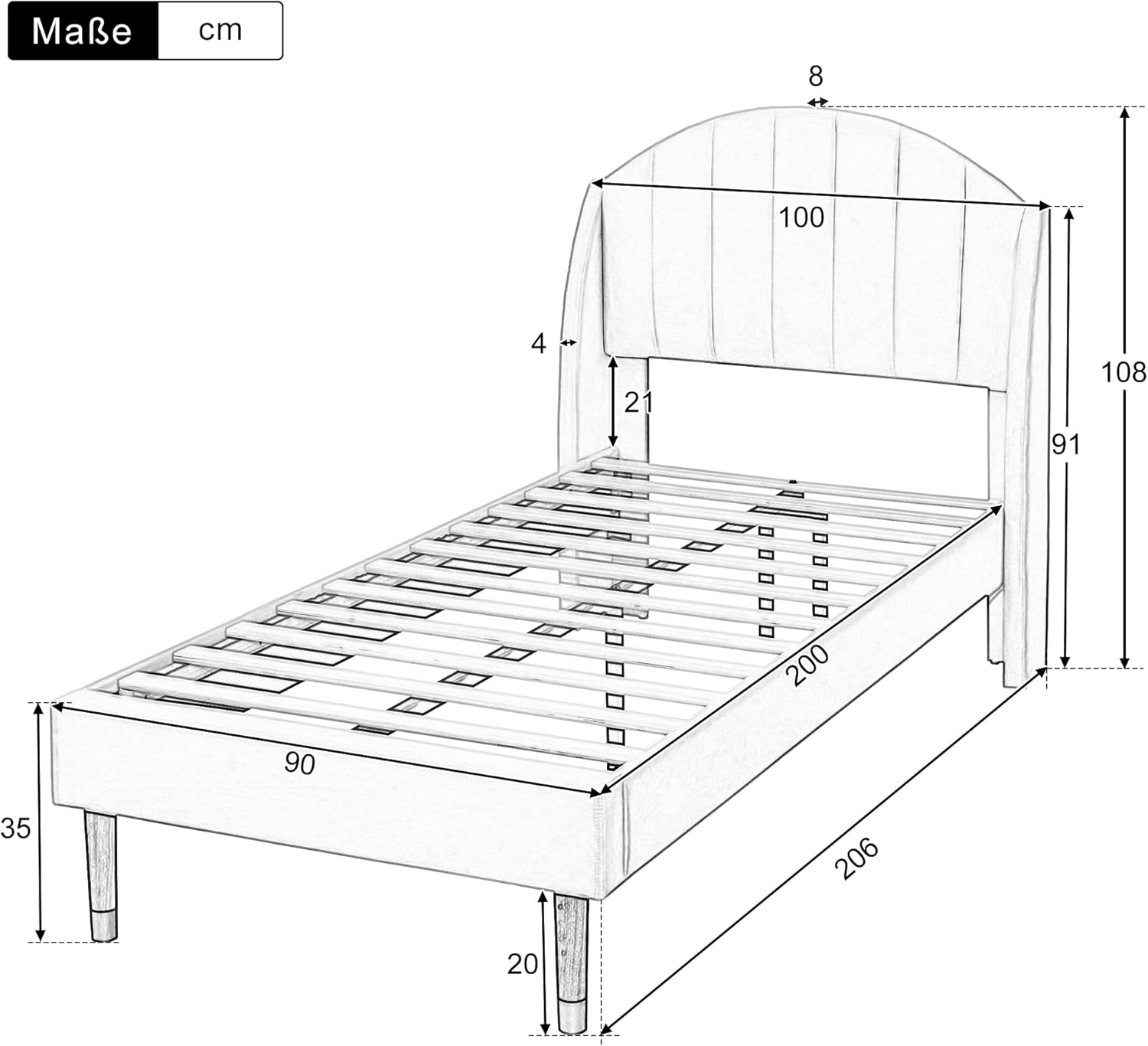 Das Bettgestell ist stabil und einfach aufzubauen. Die Liegefläche beträgt 90×200 cm. Holzlatten minimieren Geräusche während des Schlafs und verlängern die Lebensdauer der Matratze. Der Lattenrost mit stabilisierender Mittelleiste sorgt für zusätzliche Robustheit, während ergänzende Stützfüße einen festen Stand garantieren.