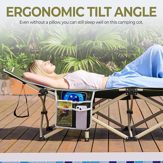 Die leicht geneigte Liegefläche sorgt auch ohne Kissen für eine angenehme Schlafposition. Eine seitlich befestigte Tasche bietet Platz für persönliche Gegenstände wie Schlüssel, Handy oder Buch.