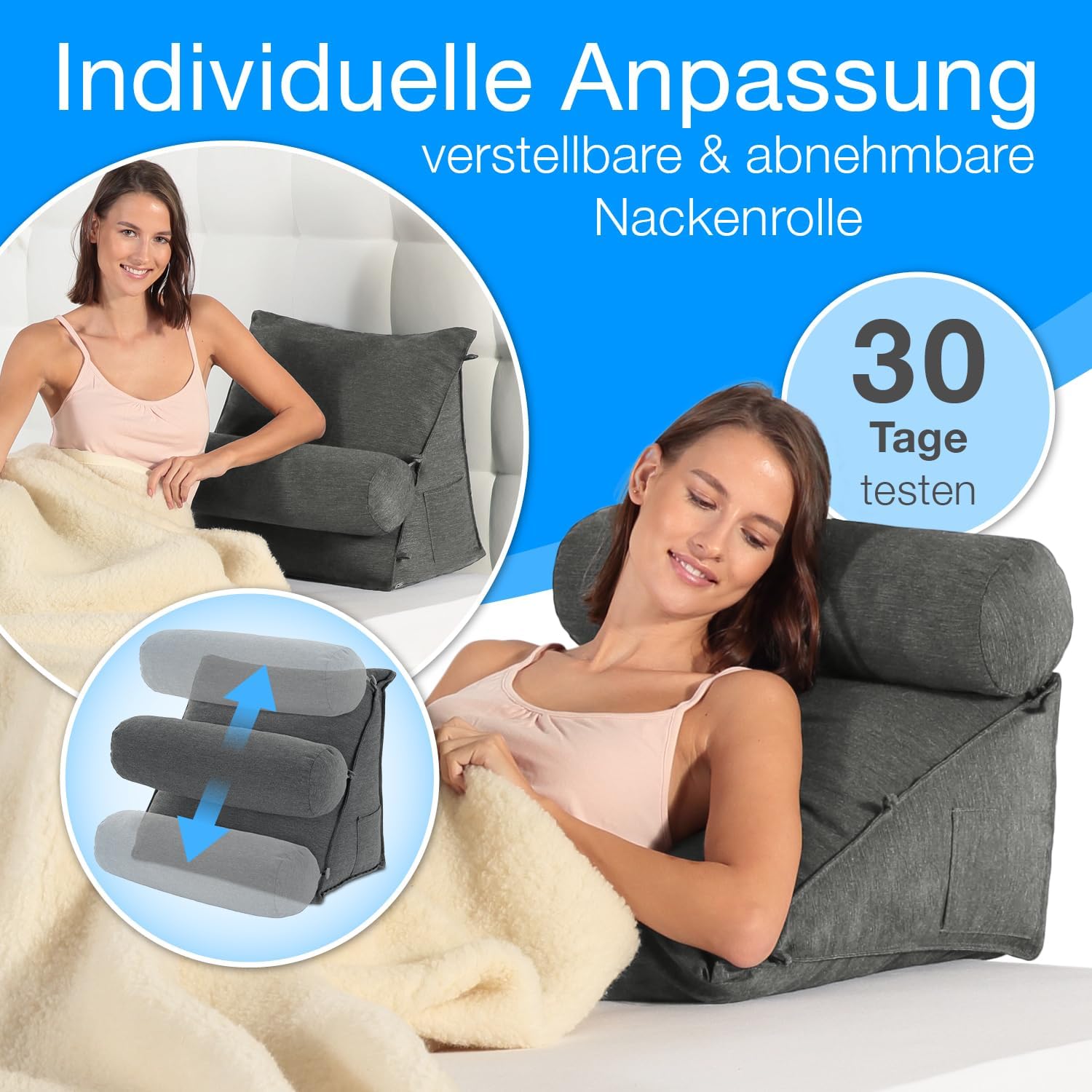 Variable Nackenrolle: Die zugehörige Nackenrolle kann vom Rückenkissen gelöst und an drei verschiedenen Stellen des Keilkissens fixiert werden – für perfekten Komfort in jeder Position.