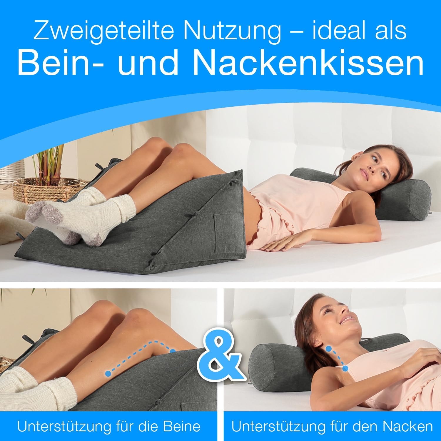 Auch zur Hochlagerung der Beine geeignet: Dank seiner Keilform ist das Lesekissen mit Nackenrolle nicht nur für den Oberkörper, sondern auch optimal zur Hochlagerung der Beine geeignet – perfekt bei schweren oder müden Beinen.
