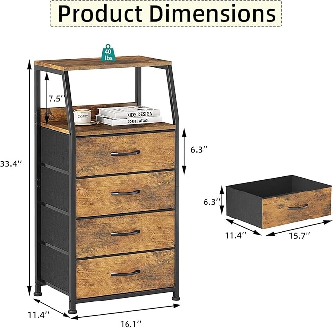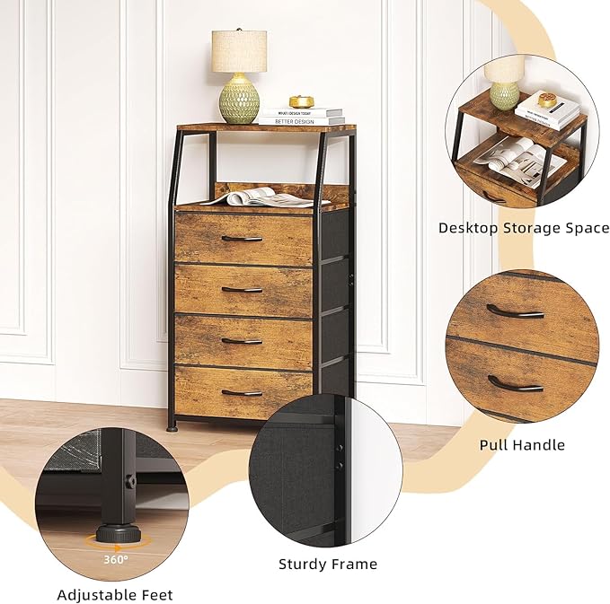 Diese Kommode verfügt über 4 Stoffschubladen und 2 Holzregal-Ebenen oben, die reichlich Platz für Kleidung, Accessoires und wichtige Dinge bieten. Jede Schublade ist optimal gestaltet, um Ihren Raum im Schlafzimmer, Wohnzimmer oder der Garderobe ordentlich und organisiert zu halten.