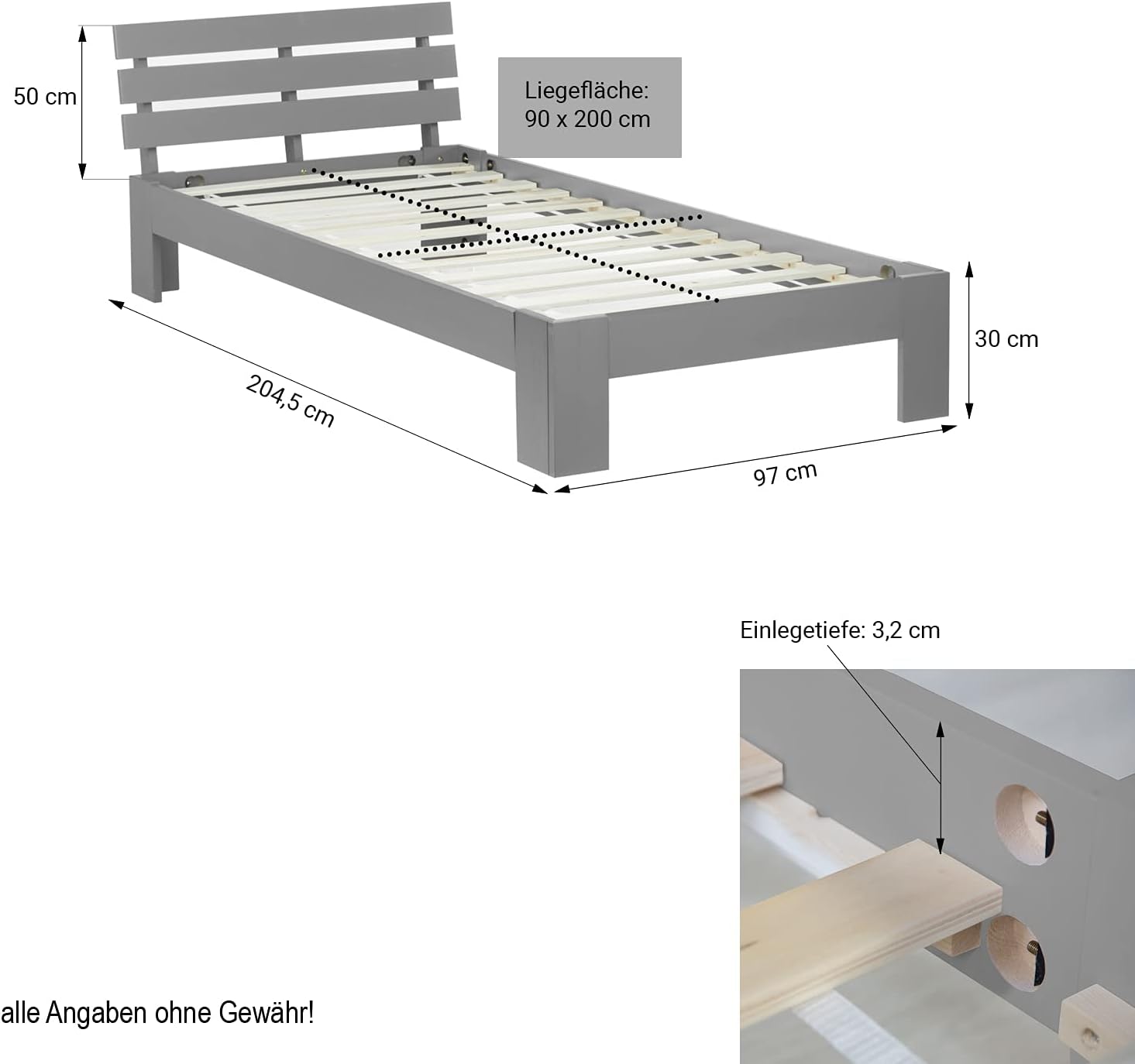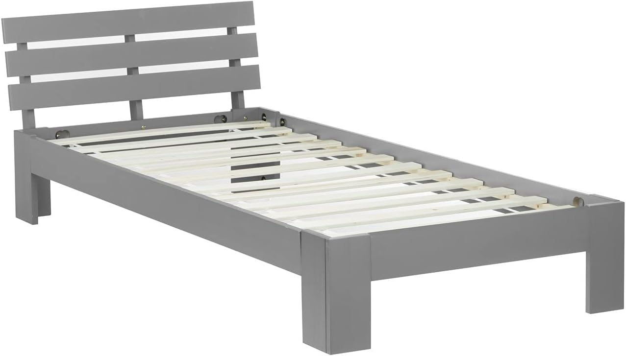 Das Set wird mit einer klaren Aufbauanleitung geliefert, sodass die Montage schnell und unkompliziert erfolgt. Im Lieferumfang enthalten sind der graue Massivholzrahmen und der passende Lattenrost.