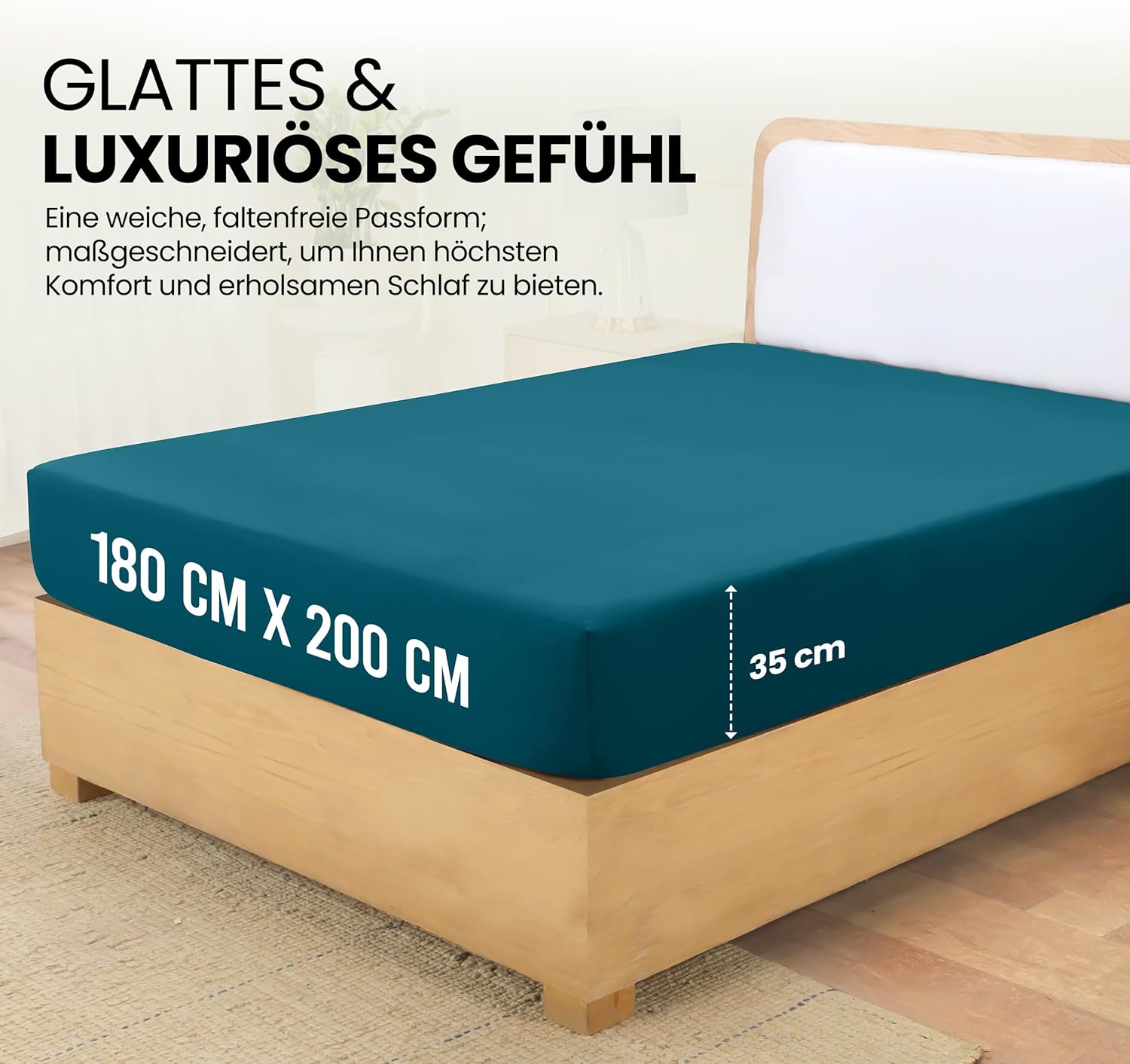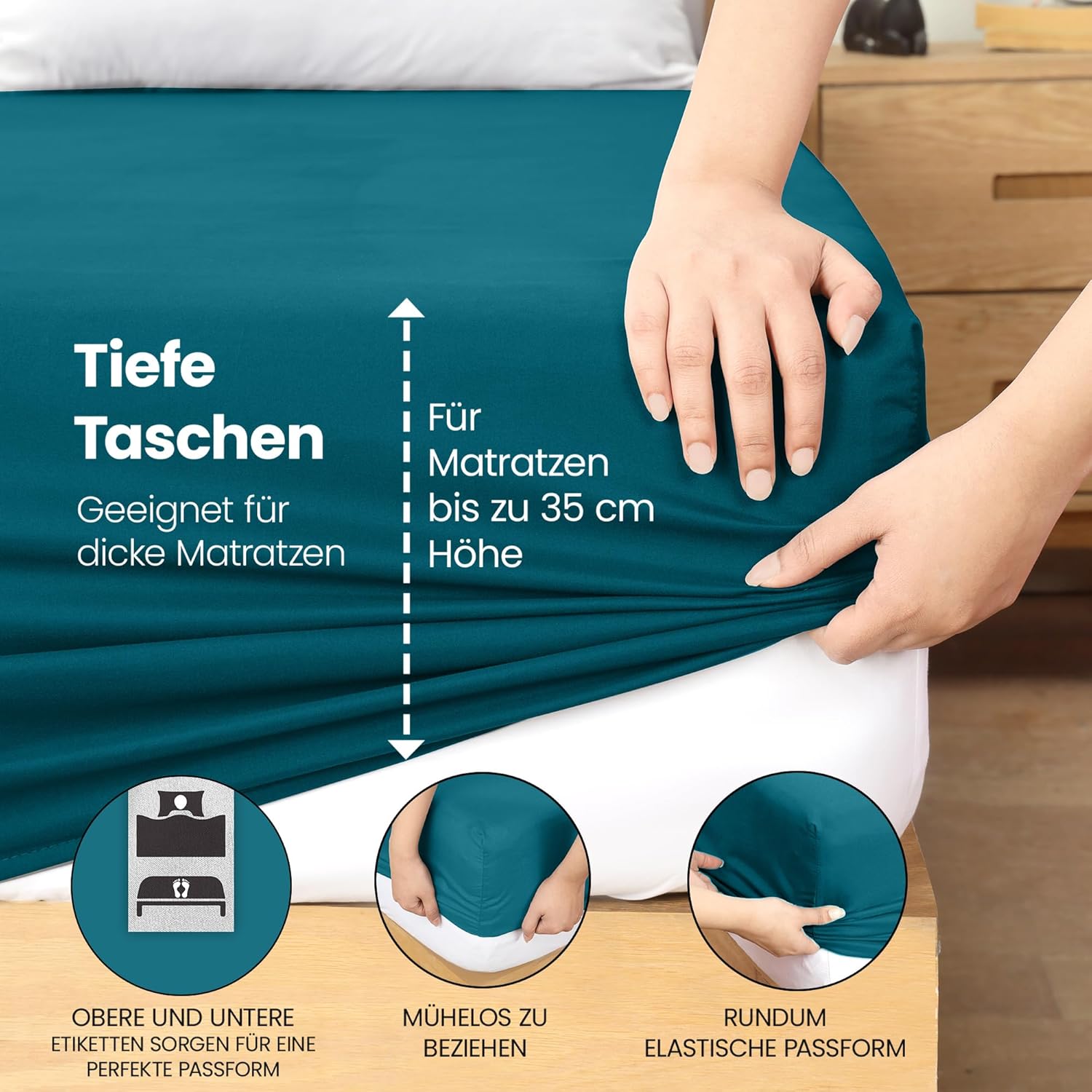 Das Set enthält ein Spannbettlaken in der Größe 180 x 200 cm mit extra tiefen Taschen von 35 cm. Diese sorgen für einen sicheren und faltenfreien Sitz auf Matratzen, auch bei hohen Modellen oder mit Toppern, und garantieren somit eine perfekte Passform und ein ordentlich bezogenes Bett.