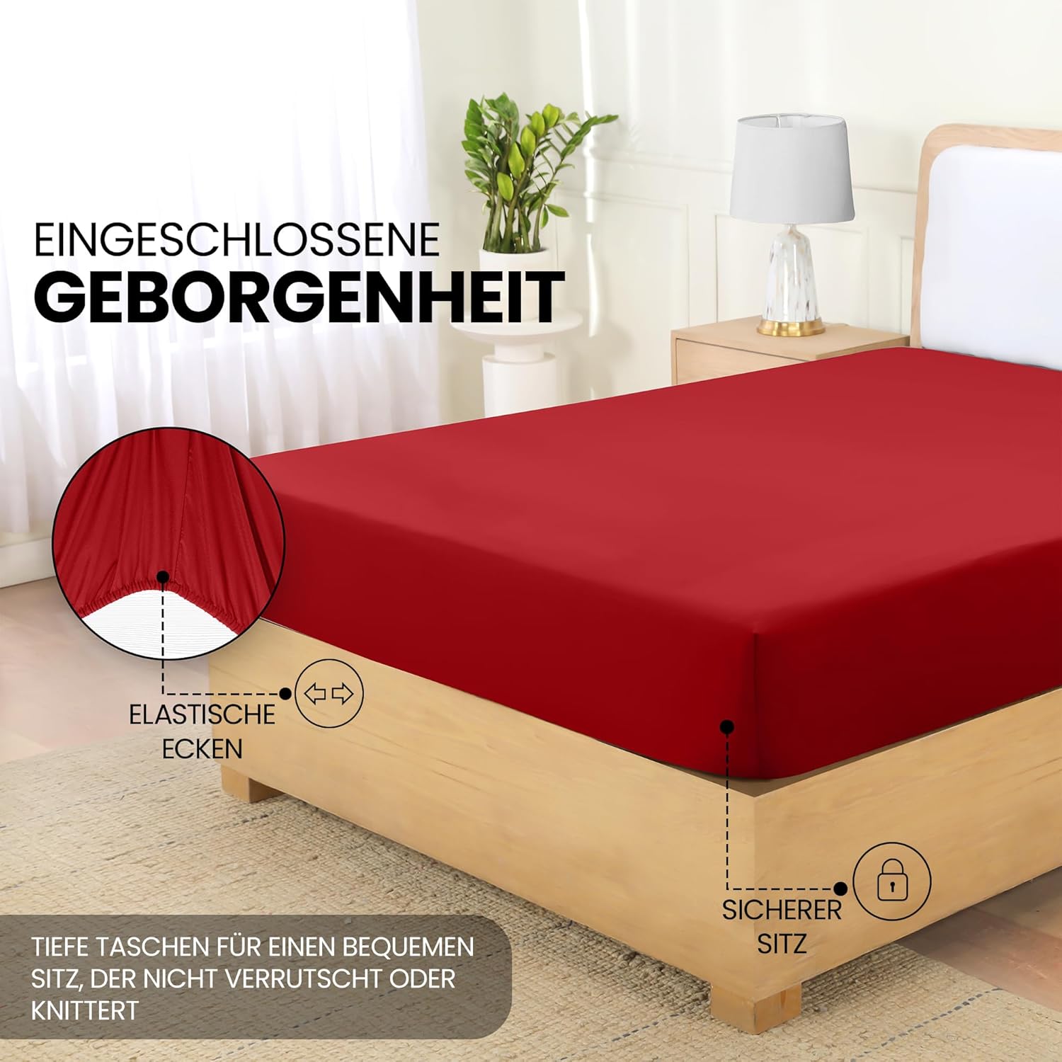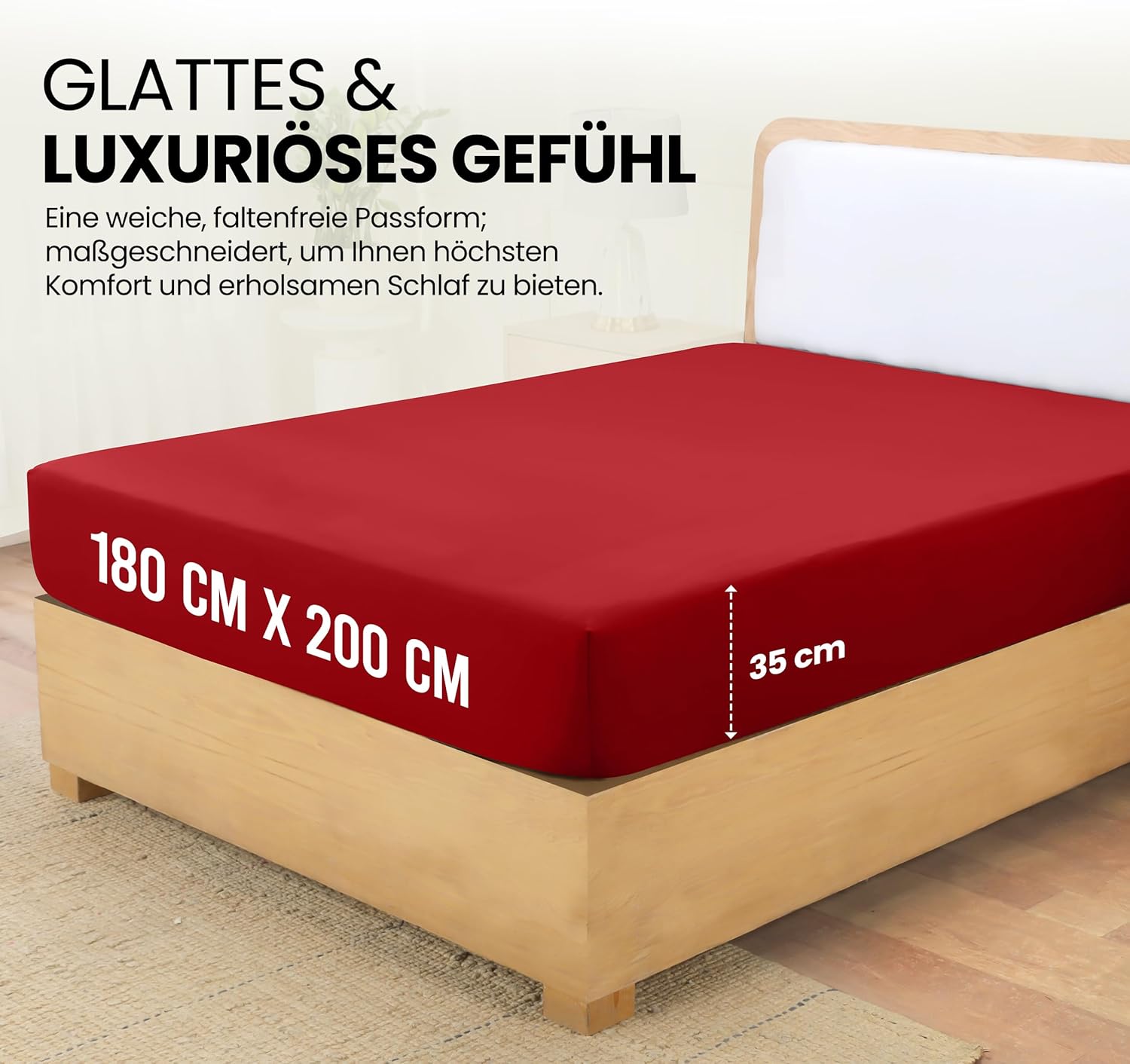 Das Set enthält ein Spannbettlaken in der Größe 180 x 200 cm mit 35 cm tiefen Ecken, die auch bei hohen Matratzen oder Toppern für sicheren Halt sorgen. So sitzt das Laken stets faltenfrei und verleiht dem Bett eine gepflegte, ordentliche Optik für erholsamen Schlafkomfort.