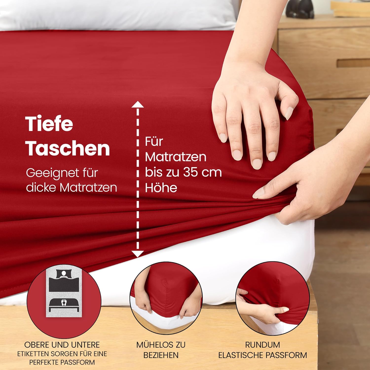 Die Rundum-Elastizität ermöglicht eine perfekte Anpassung an jede Matratze. Das Laken schmiegt sich faltenfrei und straff an, was eine glatte, gepflegte Oberfläche schafft. Diese flexible Passform erleichtert das Beziehen und sorgt für ein harmonisches Gesamtbild im Schlafzimmer.