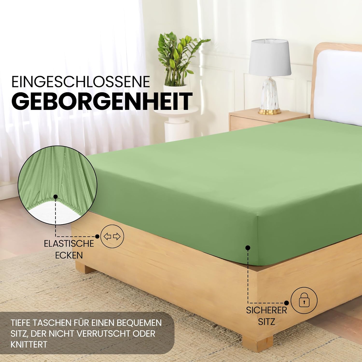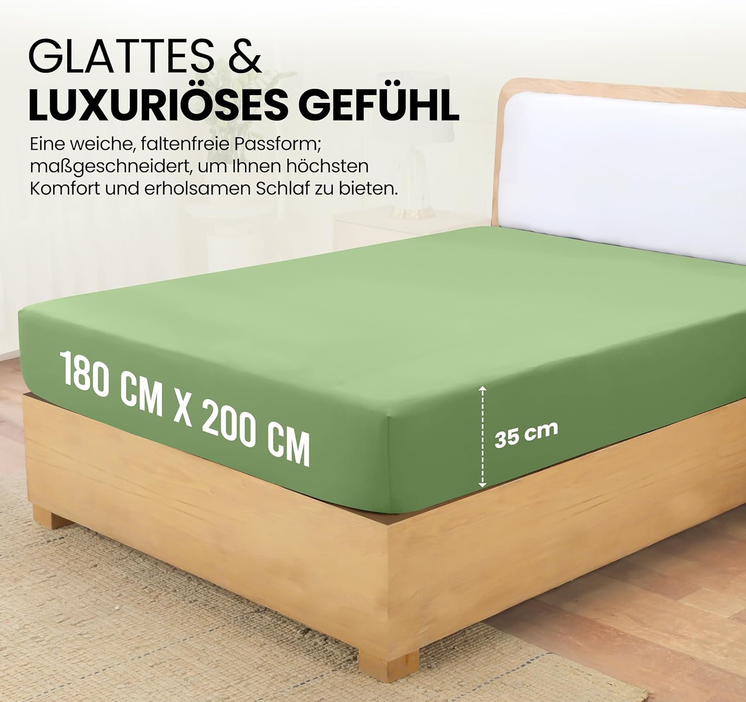 • Enthalten ist ein Spannbettlaken in der Größe 180 x 200 cm mit 35 cm tiefen Ecken, das ideal für Standard- und hohe Matratzen geeignet ist. Die großzügige Eckhöhe sorgt für sicheren Halt und eine faltenfreie Passform, damit das Bett stets ordentlich und gepflegt aussieht.