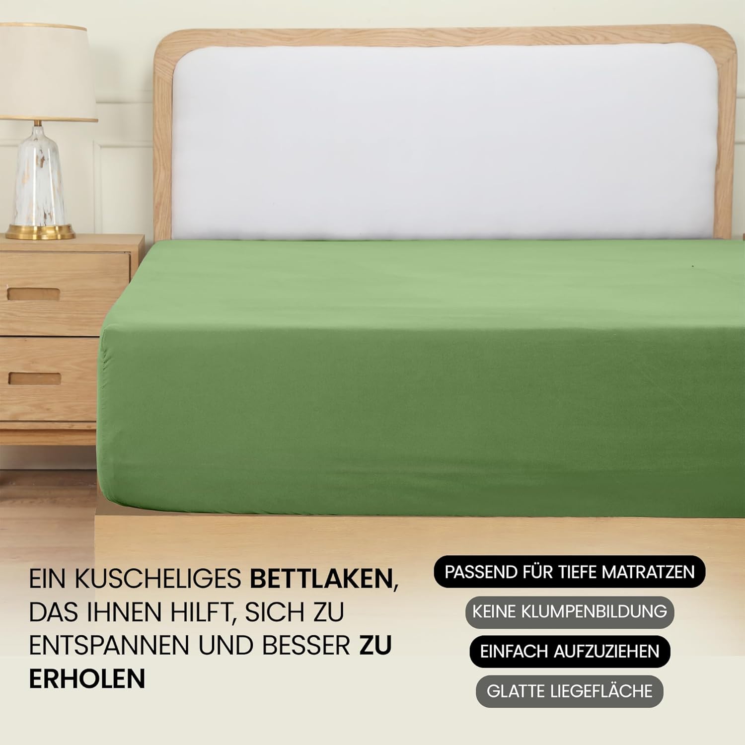• Dank der elastischen Rundumkante passt sich das Spannbettlaken flexibel und sicher an jede Matratze an. Es bleibt straff und faltenfrei auf der Matratze liegen und verleiht dem Bett eine glatte, hochwertige Optik, die das Schlafzimmer optisch aufwertet und für Ordnung sorgt.