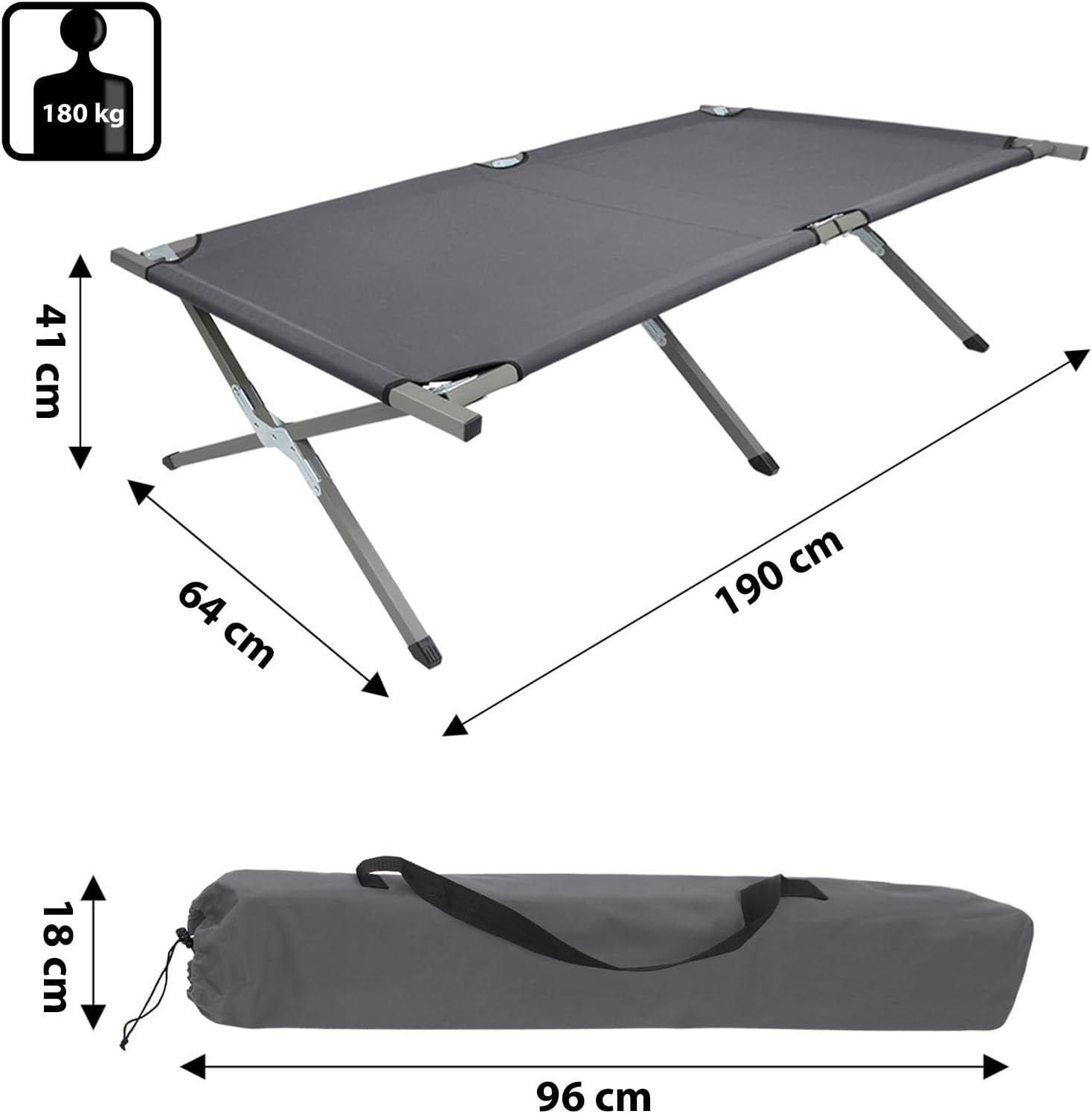 With dimensions of 190 x 64 x 41 cm, the camp bed offers ample space for restful sleep. The durable 600D polyester cover is easy to care for and washable, ensuring a high level of comfort even during extended use.
