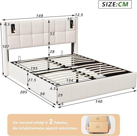 This double bed features a gas lift mechanism that allows smooth lifting of the slatted frame, giving easy access to the large storage area underneath. Perfect for storing bedding, blankets, and seasonal accessories, it keeps the room organized and clutter-free. With its 140 x 200 cm size, it is designed to maximize living space while maintaining comfort and practicality in any bedroom.