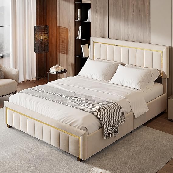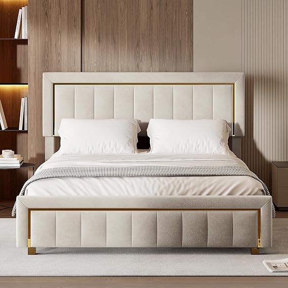 With its refined minimalist look and gold decorative trim, this upholstered bed adds sophistication to any bedroom style, from contemporary to classic. The padded velvet headboard enhances comfort and visual appeal, making the room feel more cosy and stylish. A perfect choice for those who want both beauty and functionality in their sleeping space.
