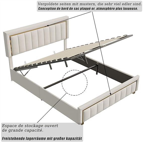 Designed to optimize room space, the hidden storage compartment provides ample room for storing blankets, clothing, and bulky items out of sight. The lift-up mechanism keeps belongings easily accessible while helping to maintain a neat and clutter-free environment. A convenient and stylish solution for smaller rooms or anyone needing extra storage.