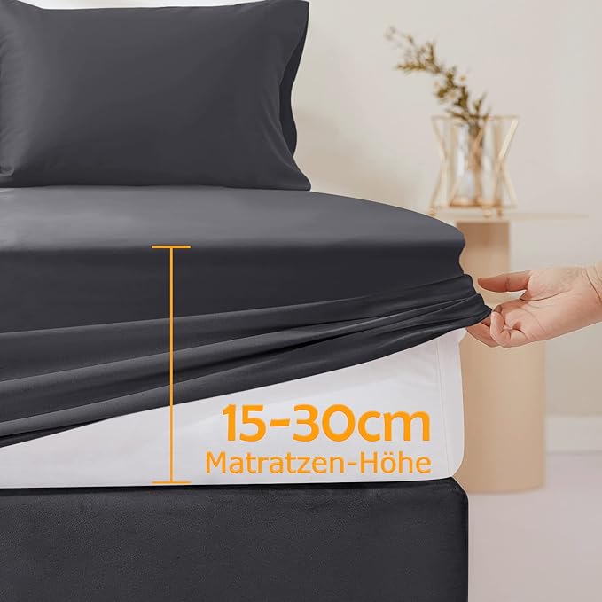 Erhältlich in 90×200, 120×200, 140×200, 160×200, 180×200 und 200×200 cm – passend für Matratzen bis zu 30 cm Höhe.