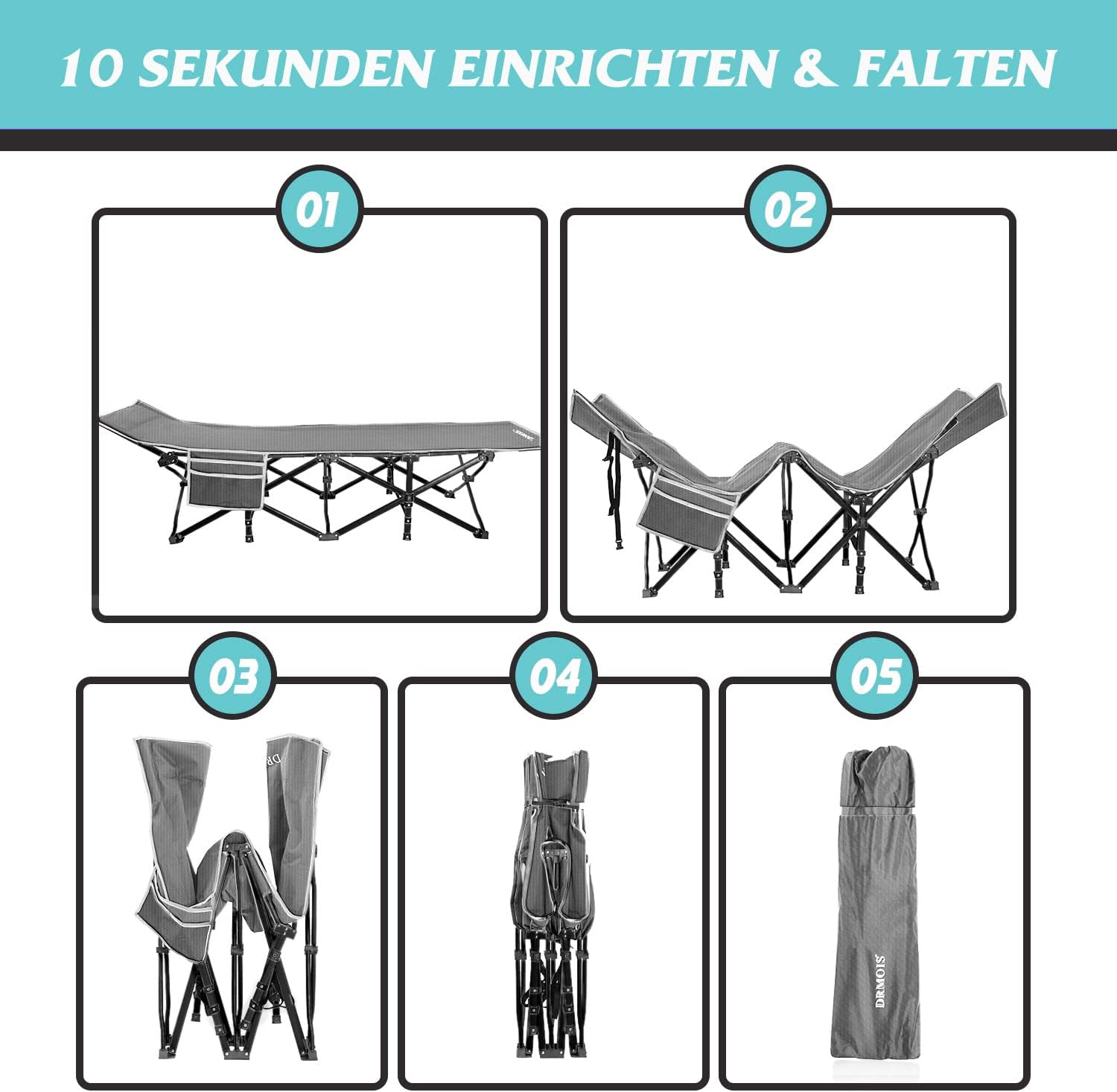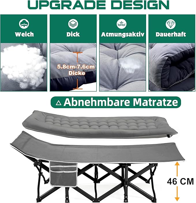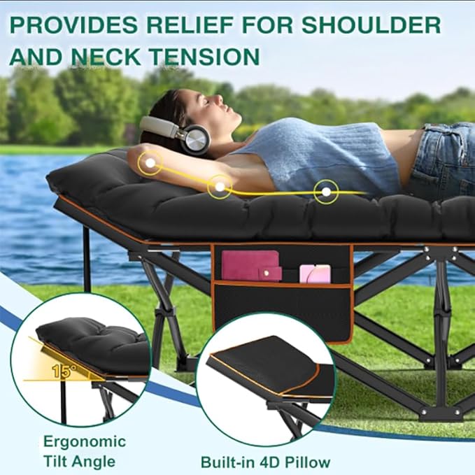Das 1680D Oxford-Gewebe ist reißfest, wasserabweisend und atmungsaktiv – ideal für den Outdoor-Einsatz. Die ergonomische Rahmenform mit leicht erhöhter Kopfstütze beugt Nacken-, Rücken- und Schulterschmerzen vor. Integrierte Seitentaschen und Netztaschen bieten praktischen Stauraum für Handy, Wasserflasche, Schlüssel und mehr.