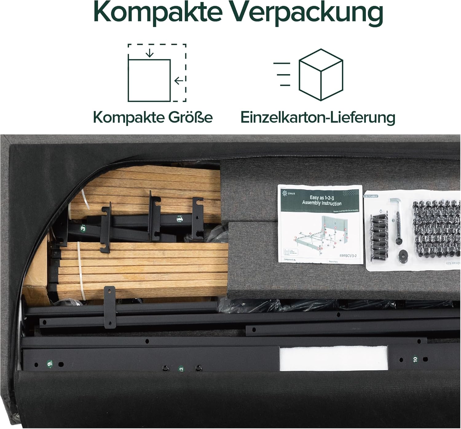 • EINFACHE MONTAGE – Alle benötigten Teile, Werkzeuge und Anleitungen befinden sich kompakt im Reißverschlussfach des Kopfteils. Die Montage gelingt mit zwei Personen in weniger als einer Stunde und wird platzsparend in einem Karton geliefert.